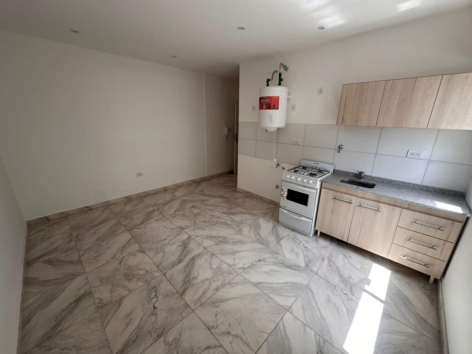 Amplio living comedor con cocina integrada y termotanque eléctrico.