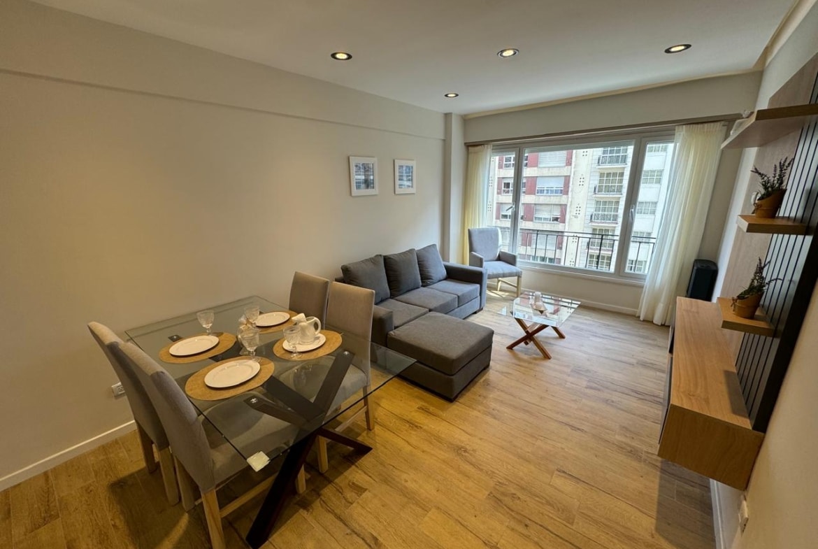 Living a la calle con balcón francés, equipado con juego de mesas y sillas, sillón y calefactor con tiro balanceado.