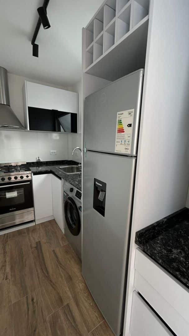 Al ingreso, espacio de living comedor totalmente amoblado con TV. Cocina equipada con lavarropas automático, cocina de acero inoxidable, heladera con freezer, mesada de cuarzo, y pileta Jhonson.