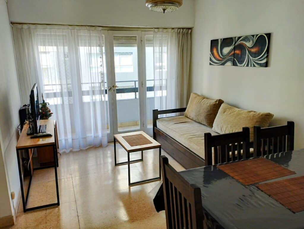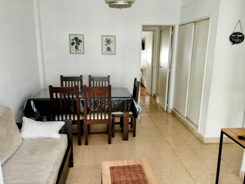 Luminoso living con mesa y 6 sillas, cama marinera tipo sillón , TV Smart 32″.