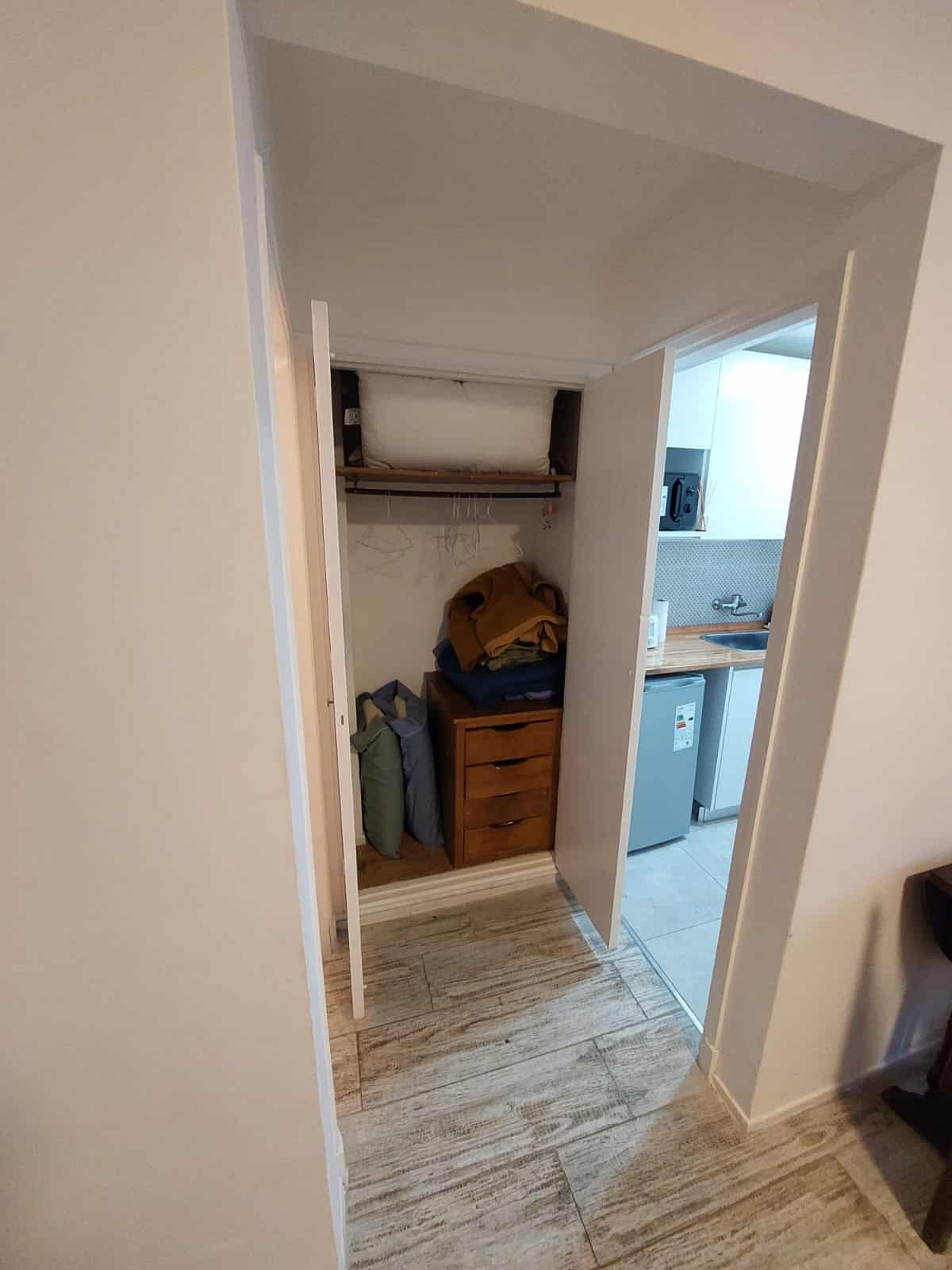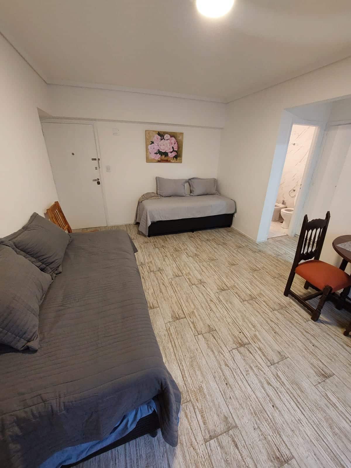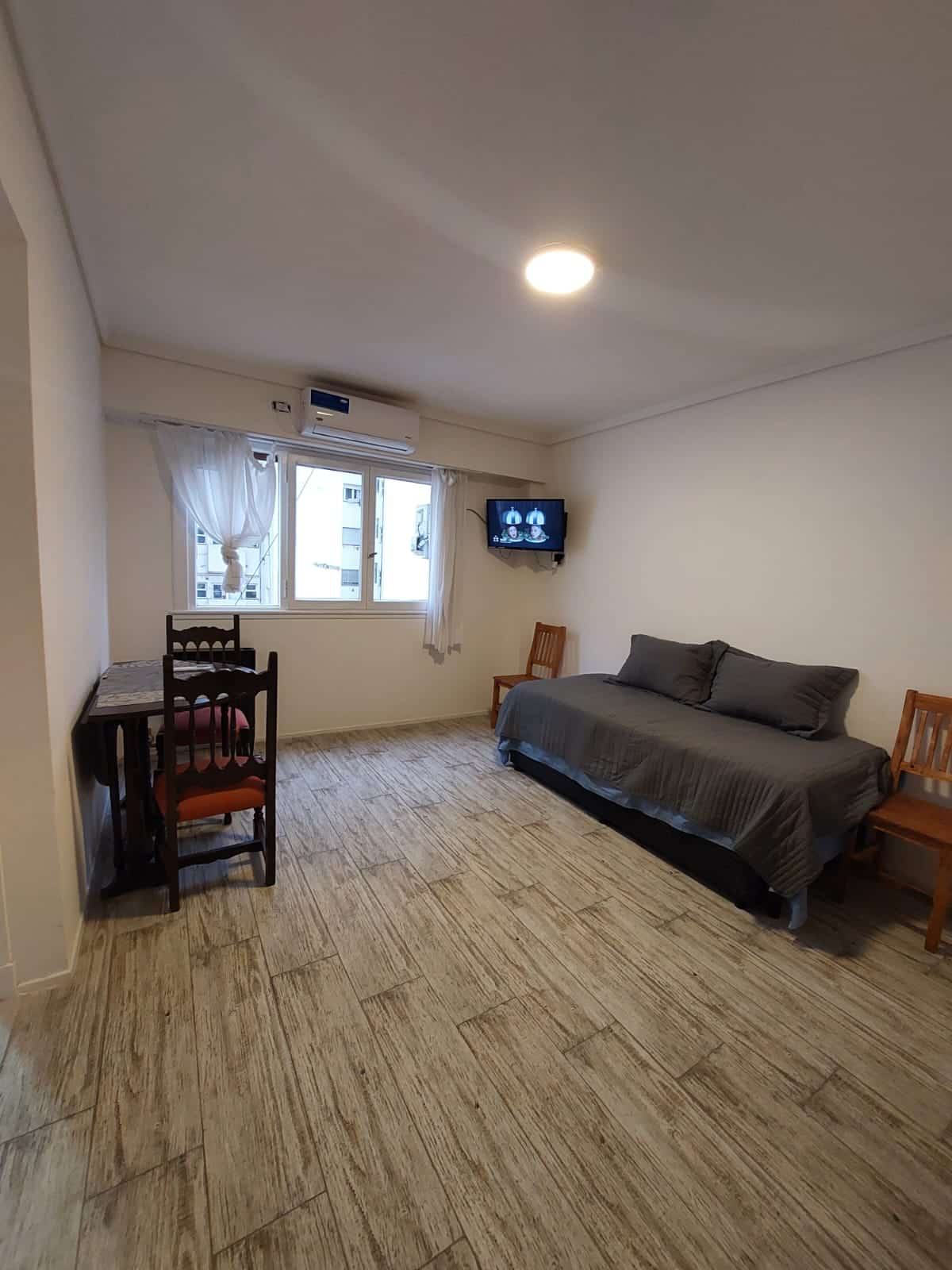 Al ingreso, ambiente único con sofá cama, placard, mesa y sillas. Ventana al contrafrente abierto lo que lo vuelve muy luminoso.