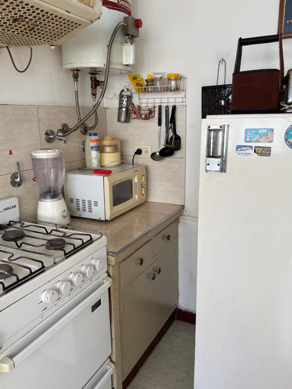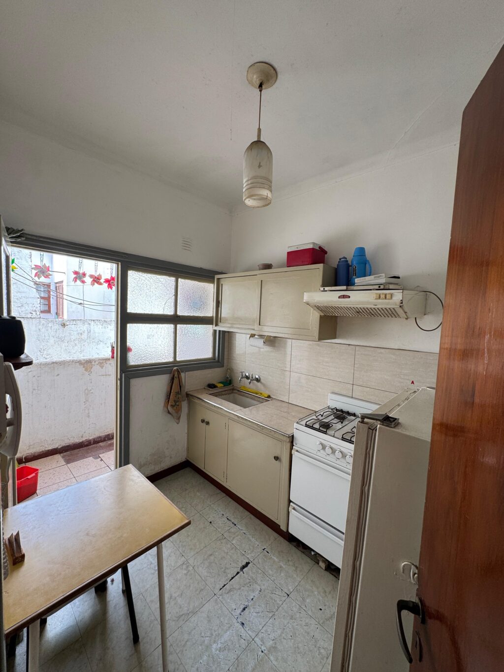 Cocina completa con termotanque a gas, microondas, heladera y balcón al contrafrente.