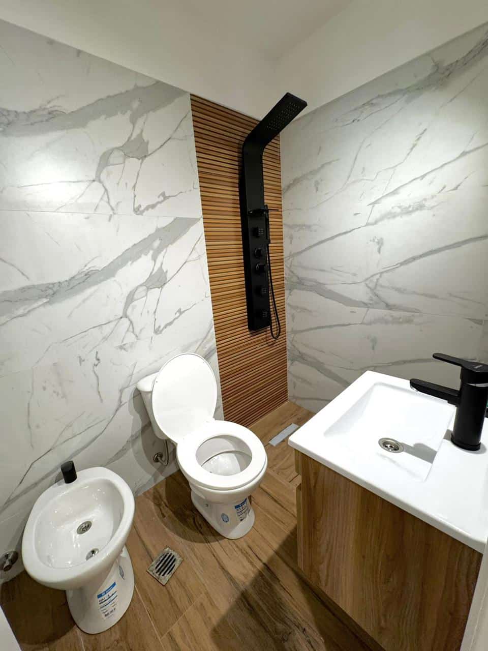 Baño con panel de ducha escocesa, con hidromasaje 3 jets monomando y duchador color negro.