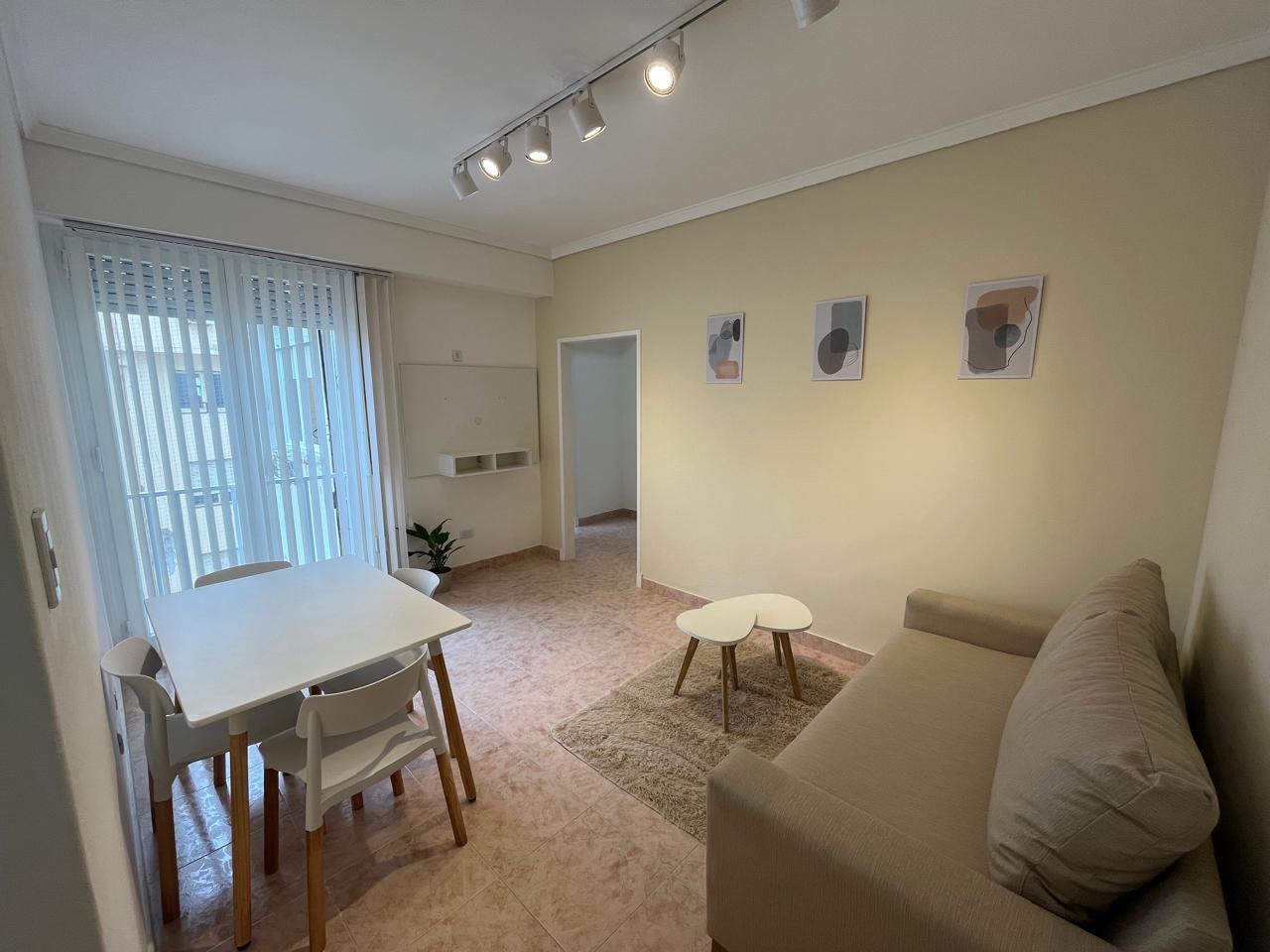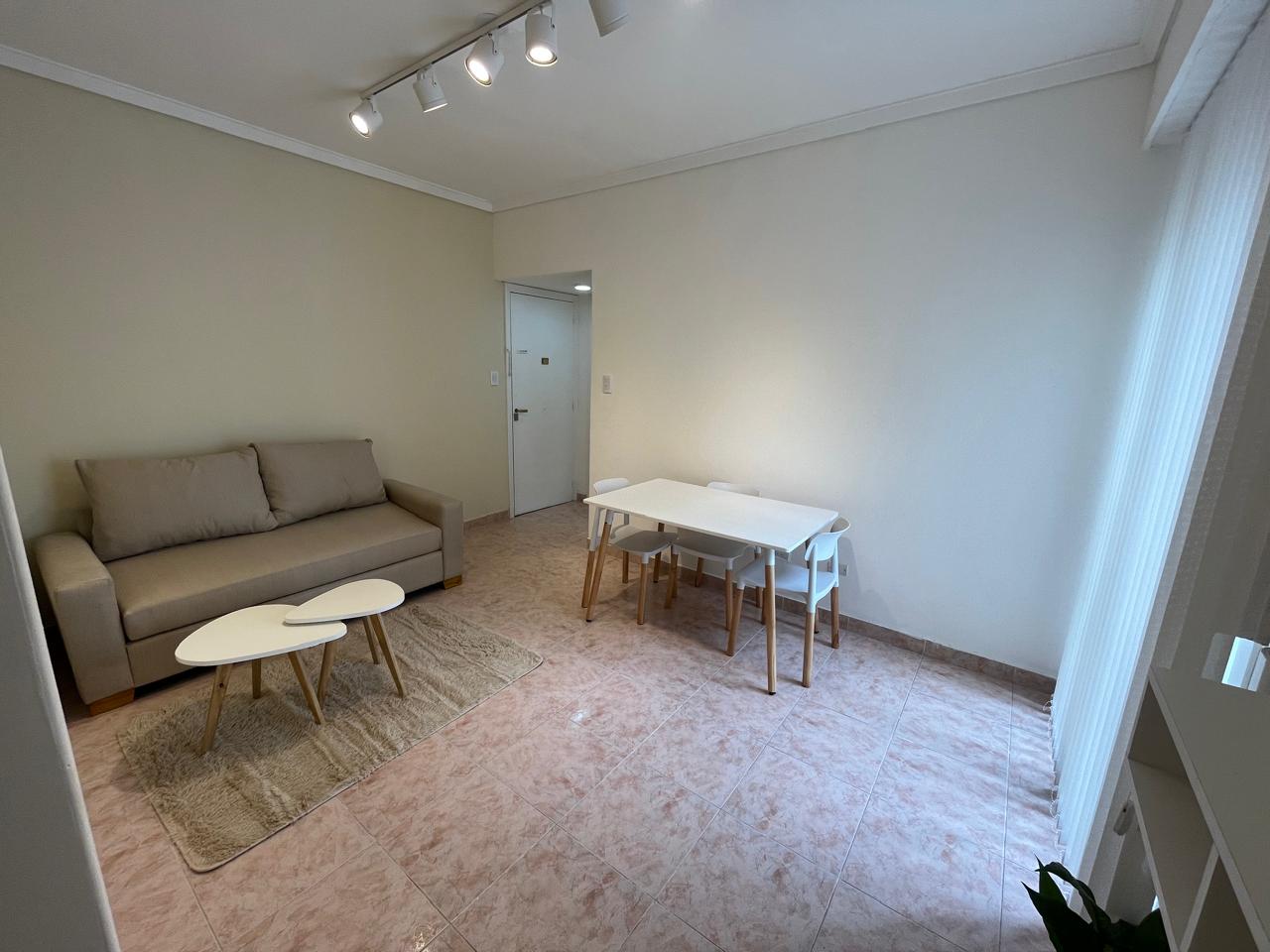 Al ingreso, living comedor al contra frente con pisos cerámicos y balcón francés. Equipado con sillón, mesa y sillas, rack de tv y mesa ratona.