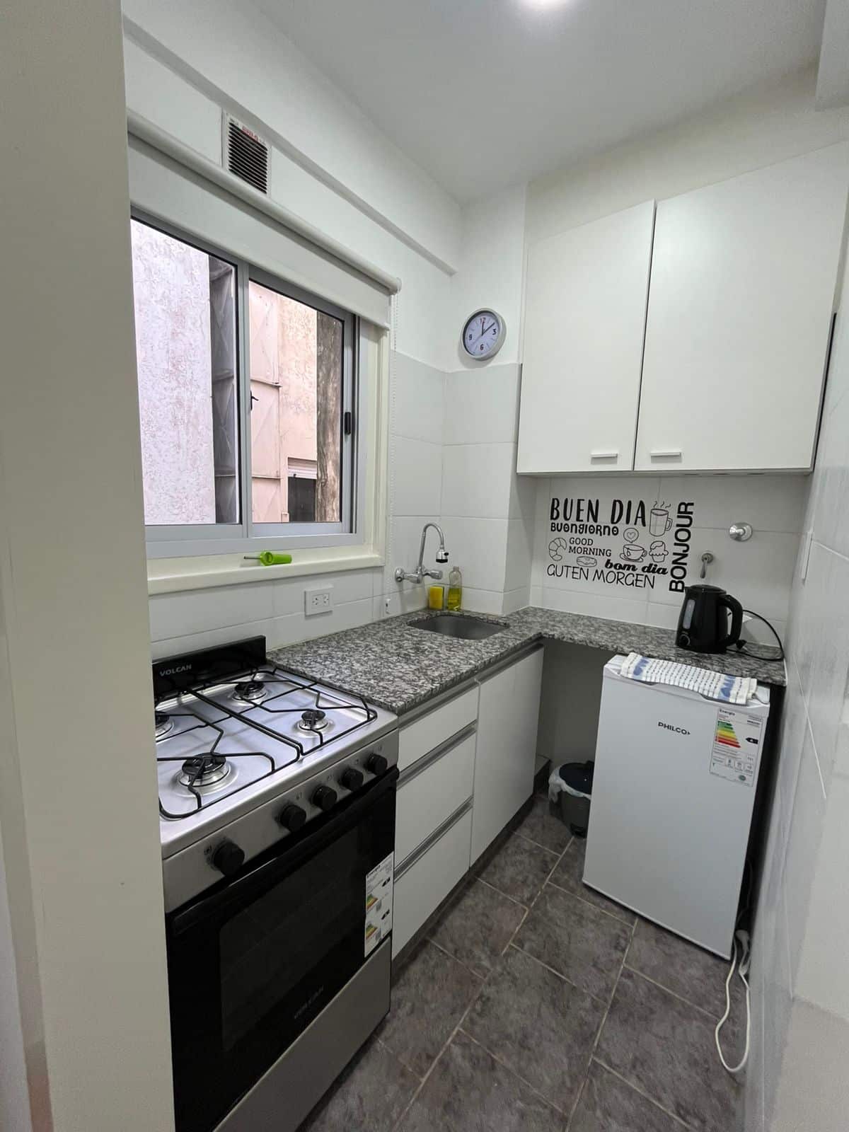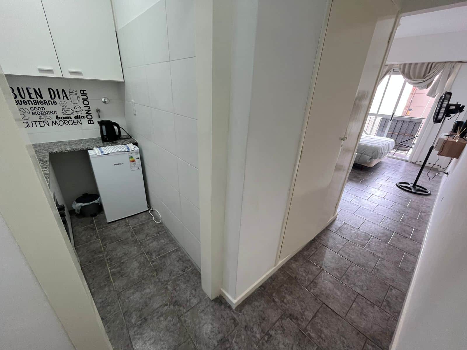 Al ingreso por pasillo distribuidor encontramos la cocina al contrafrente aggiornada con termotanque eléctrico, placard empotrado y el ambiente principal